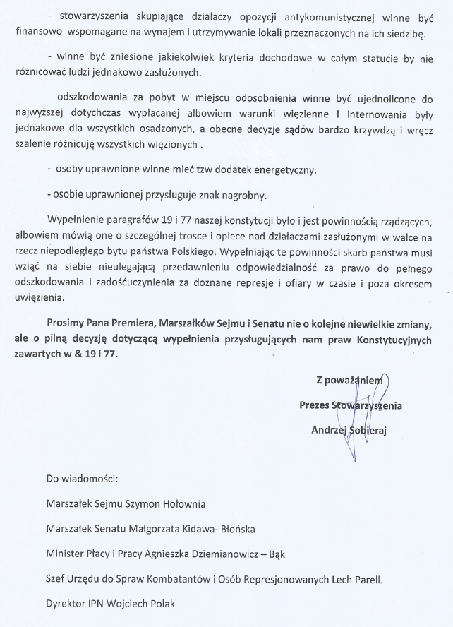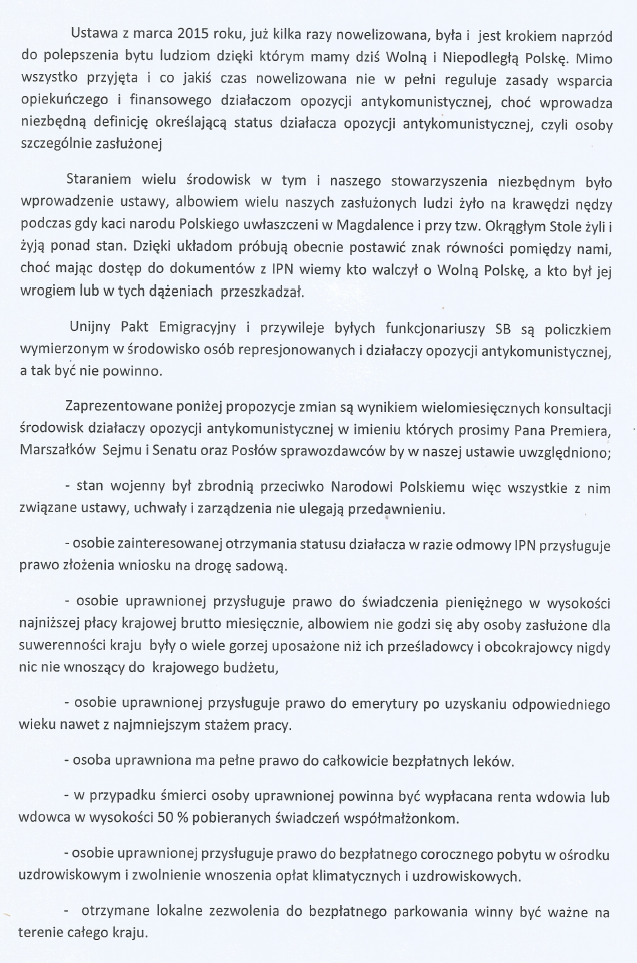 Stowarzyszenie Osób Internowanych i Represjonowanych w Stanie Wojennym, do którego należy wielu członków Związku Piłsudczyków Radom, wystosowało apel do Premiera i innych władz RP w sprawie propozycji zmian w ustawie o działaczach opozycji antykomunistycznej (DOA). Poniżej treść pisma: