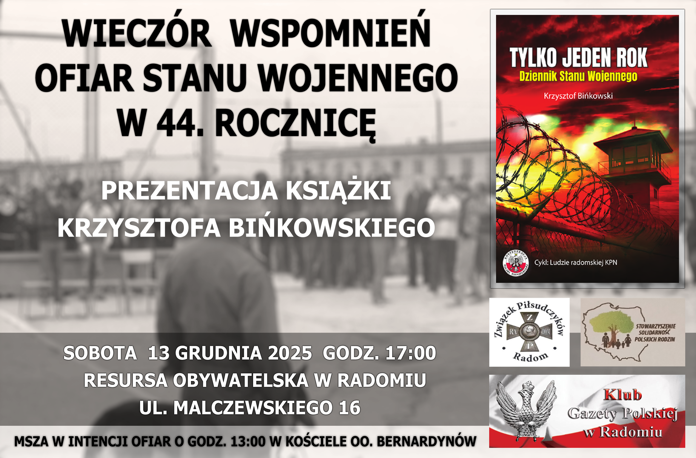 13 Grudnia obchodzimy kolejną rocznicę wprowadzenia stanu wojennego. W związku z tym zapraszamy na wieczór wspomnień o ofiarach tego czasu, połączony z prezentacją książki autorstwa Krzysztofa Bińkowskiego "Tylko jeden rok-dziennik stanu wojennego"