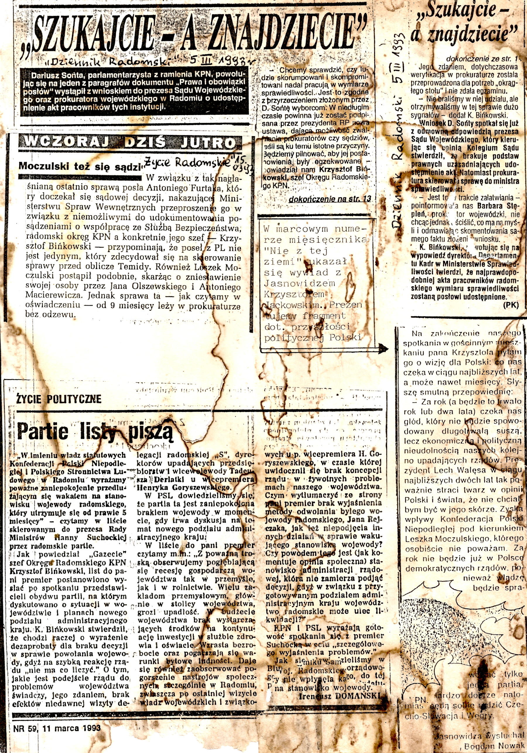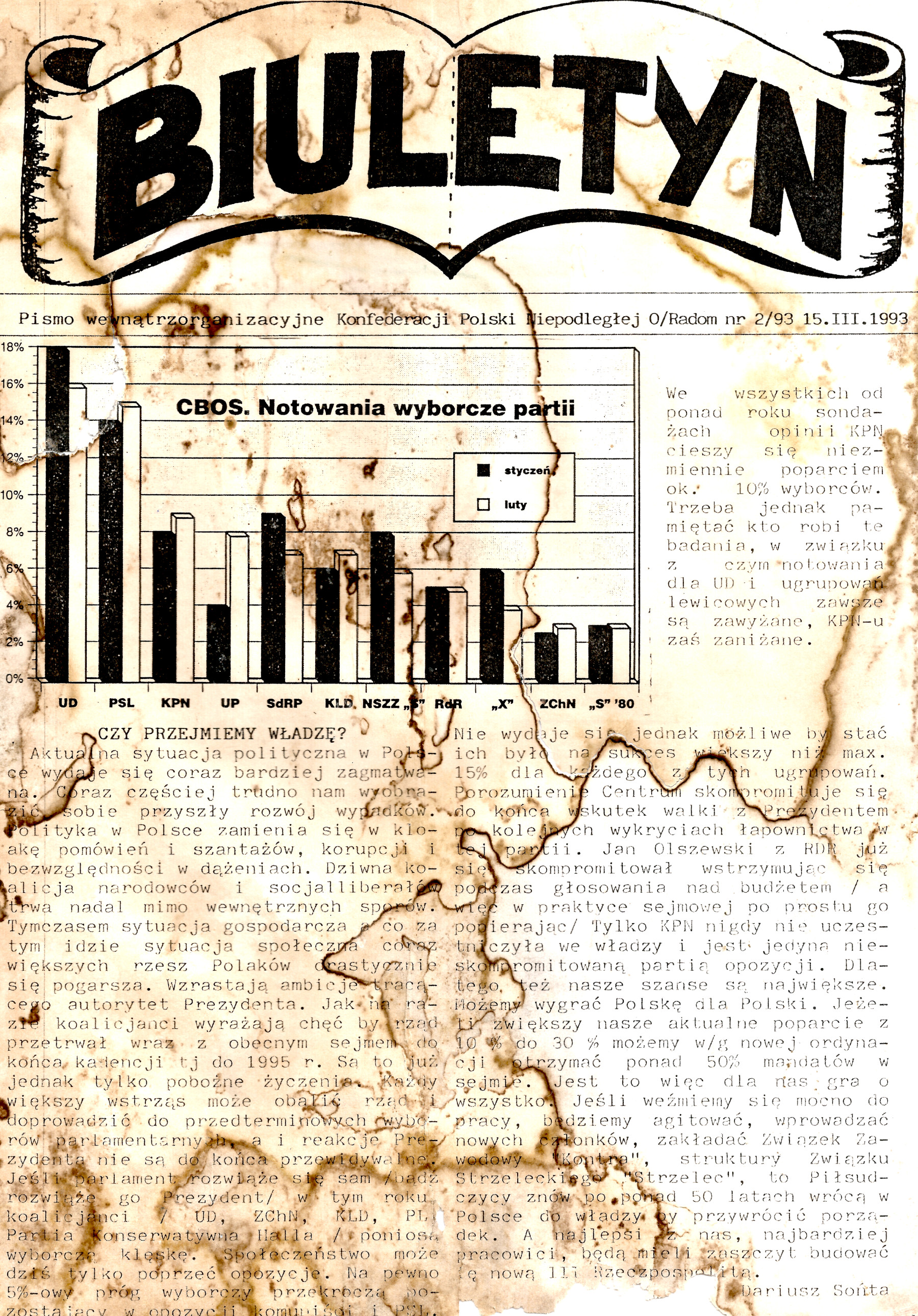 Biuletyn ten, jak wiele dokumentów KPN Okręgu Radomskiego zostało zalanych wodą w 1995 roku w naszym biurze. Biuro mieściło się w ówczesnym Hotelu Europejskim na Pl. Konstytucji w Radomiu. Wiele dokumentów uległo zniszczeniu a część ( w tym kilka worków akt osobowych członków PZPR uratowanych przed spaleniem w kotłowni komitetu partii) przepadło bezpowrotnie.