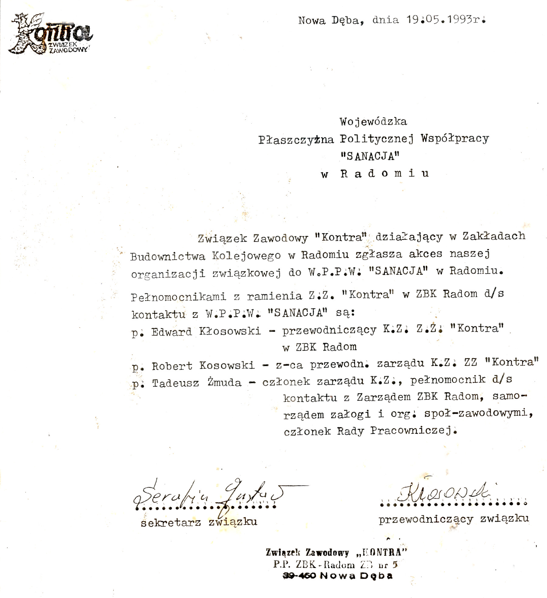 Związek Zawodowy Kontra do WPPW Sanacja 19 maja 1993 r