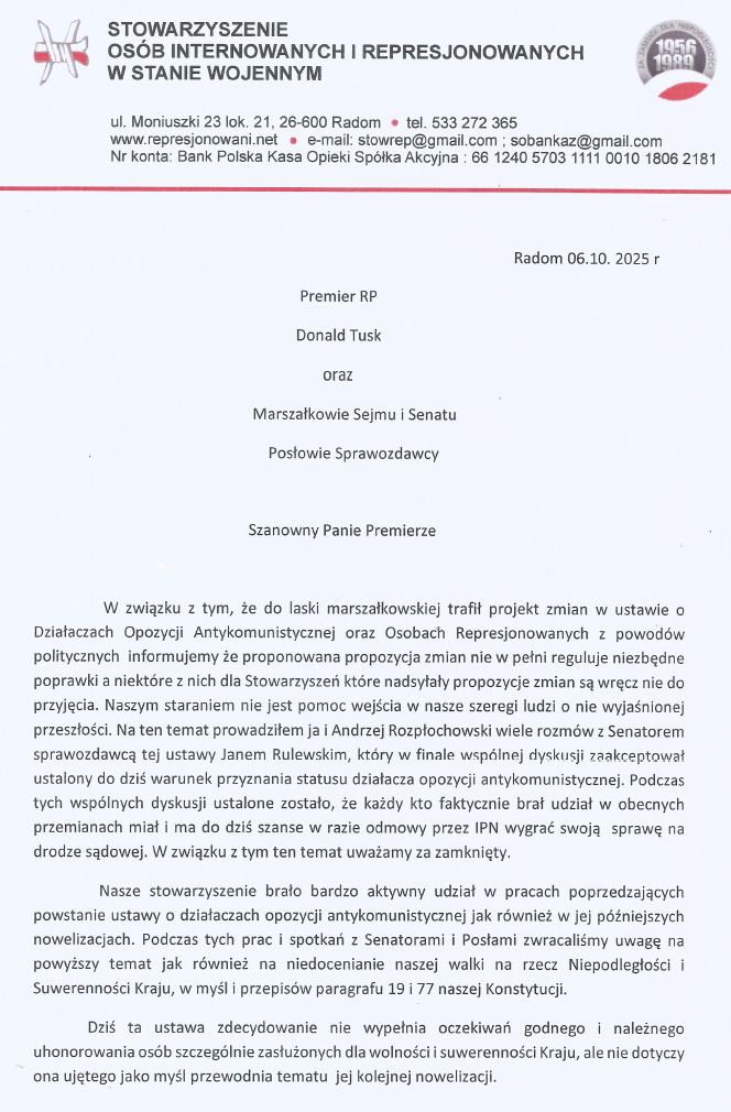 Stowarzyszenie Osób Internowanych i Represjonowanych w Stanie Wojennym, do którego należy wielu członków Związku Piłsudczyków Radom, wystosowało apel do Premiera i innych władz RP w sprawie propozycji zmian w ustawie o działaczach opozycji antykomunistycznej (DOA). Poniżej treść pisma: