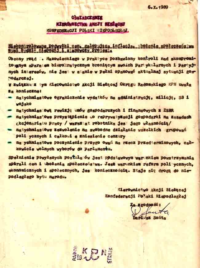 Oświadczenie KAB - Kierownictwa Akcji Bieżącej z 6.10.1989