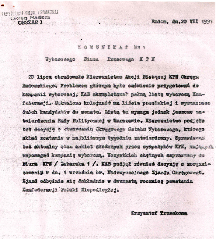 Komunikat Wyborczego Biura Prasowego 20 VII 1991