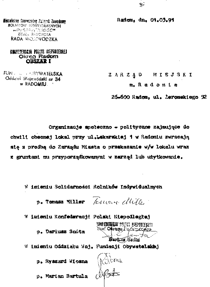 pismo do Zarządu Miejskiego z 1.03.1991 r