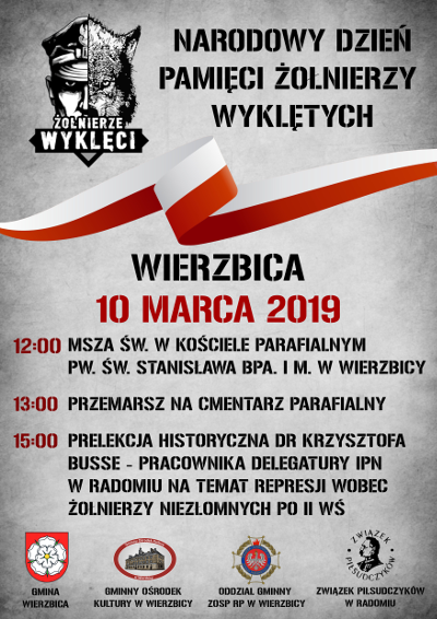 10 marca 2019 r. w Wierzbicy przedstawiciele Związku Piłsudczyków z Radomia uczcili pamięć i oddali hołd Żołnierzom Niezłomnym. Minister Wojciech Skurkiewicz wspólnie ze Starostą Waldemarem Trelką i Wójtem Zdzisławem Duliasem uhonorowali płk rez. Alfreda Kabatę medalem Zasłużony dla Powiatu Radomskiego. Poseł Robert Mordak pogratulował i podziękował Panu Pułkownikowi za wkład jaki czyni w upamiętnianiu Żołnierzy Wyklętych z naszego regionu . Na szczególną uwagę zasługuje prelekcja dr Krzysztofa Busse pracownika Delegatury IPN w Radomiu, w której przedstawił sposób działania represyjnego wymiaru sprawiedliwości wobec podziemia niepodległościowego na podstawie charakterystyki konkretnych oprawców, katów. /tekst /foto: Krzysztof Sitkowski/