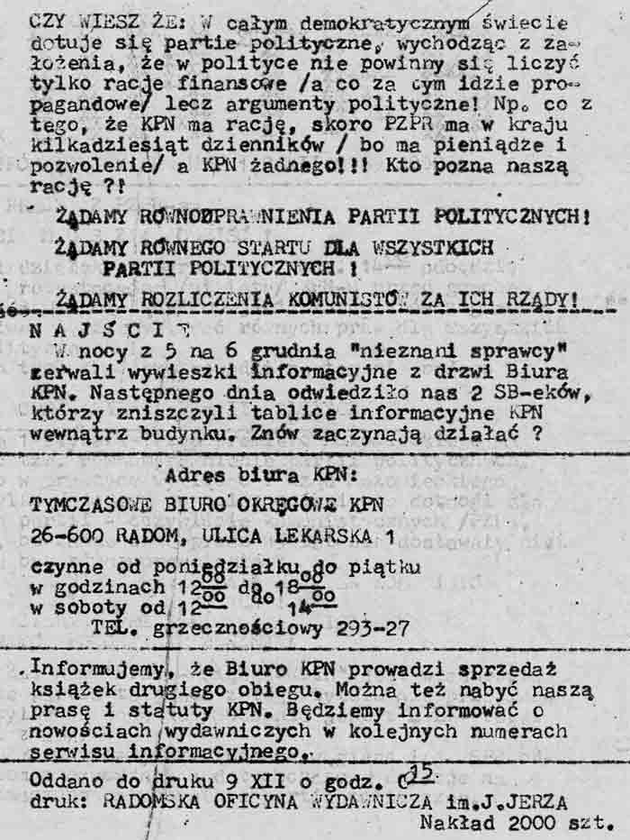 Wiele dokumentów KPN Okręgu Radomskiego zostało zalanych wodą w 1995 roku w naszym biurze. Biuro mieściło się w ówczesnym Hotelu Europejskim na Pl. Konstytucji w Radomiu. Wiele dokumentów uległo zniszczeniu a część ( w tym kilka worków akt osobowych członków PZPR uratowanych przed spaleniem w kotłowni komitetu partii) przepadło bezpowrotnie.